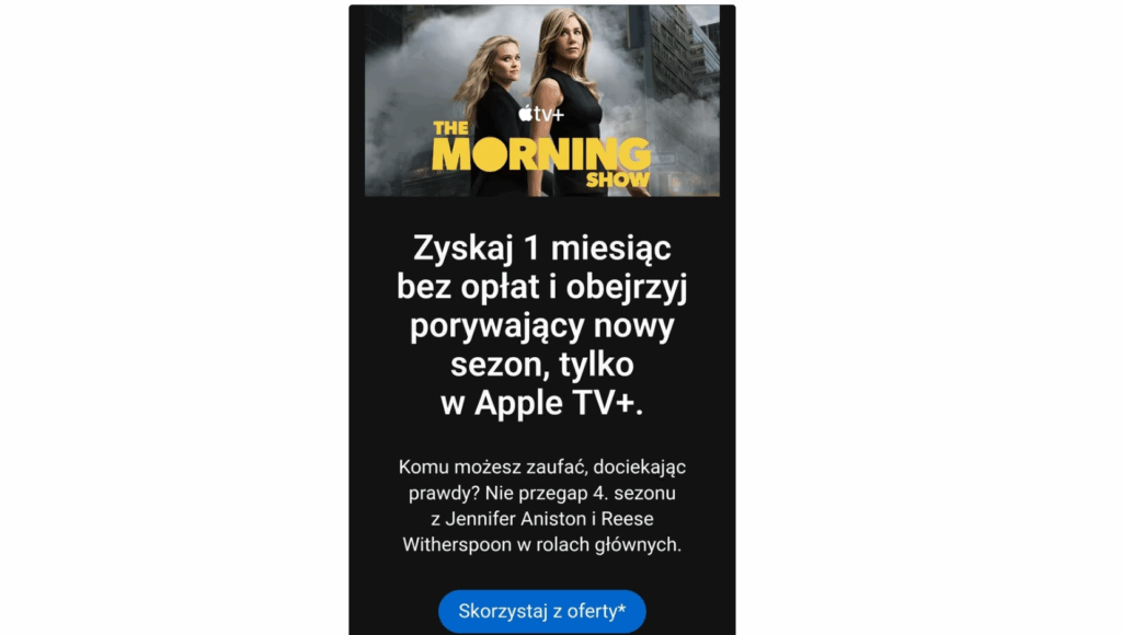 Apple TV+ za darmo jak oglądać bezpłatnie w promocji telewizję online. Nowa okazja Apple TV na 1 miesięc za darmo dla nowych i powracających. Z okazji premiery sezonu Morning Show miesiąc gratis dla powracających.