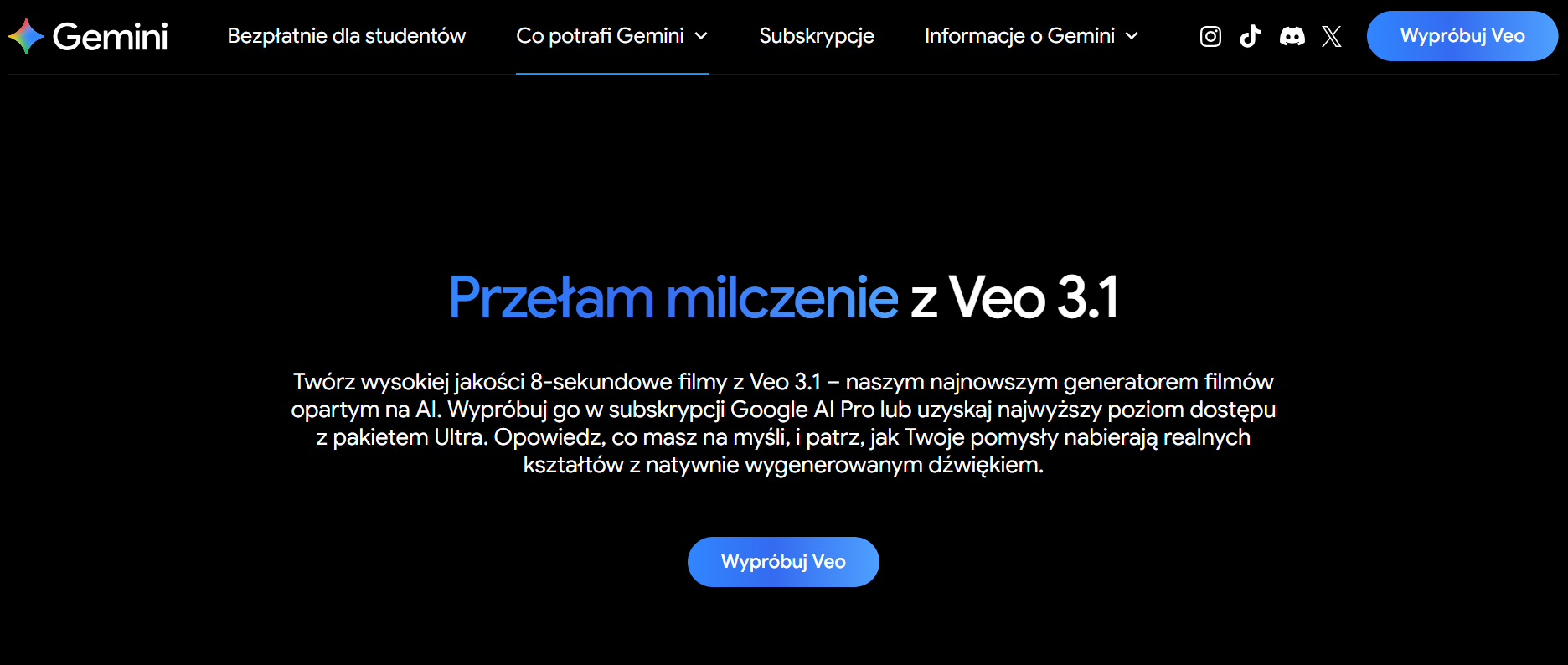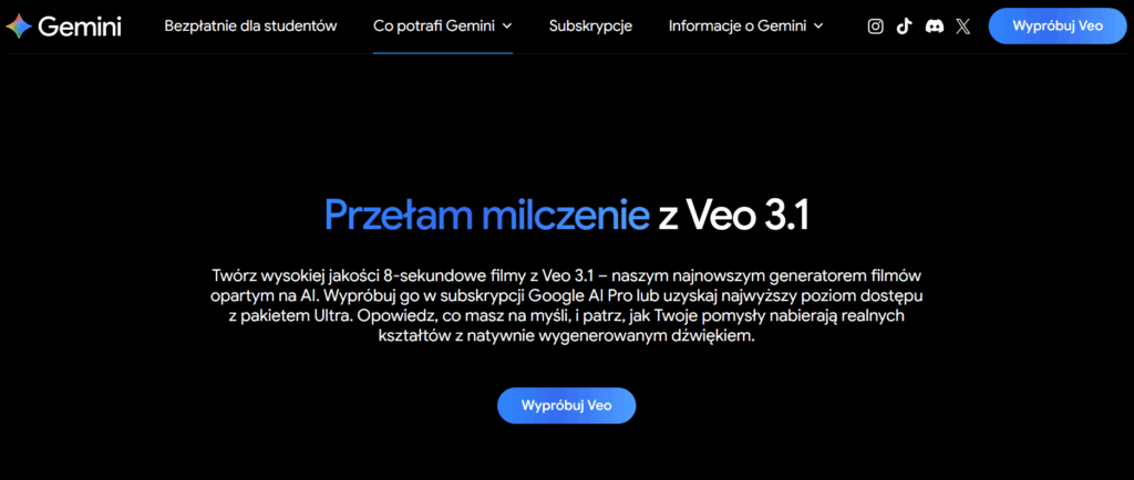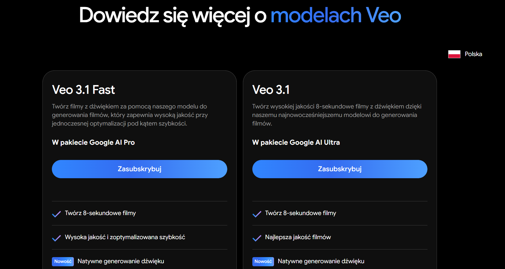 Wersje: Veo 3.1 (standard) i Veo 3.1 Fast (szybsza, dla planu Pro); wyższe limity w planie Ultra.
