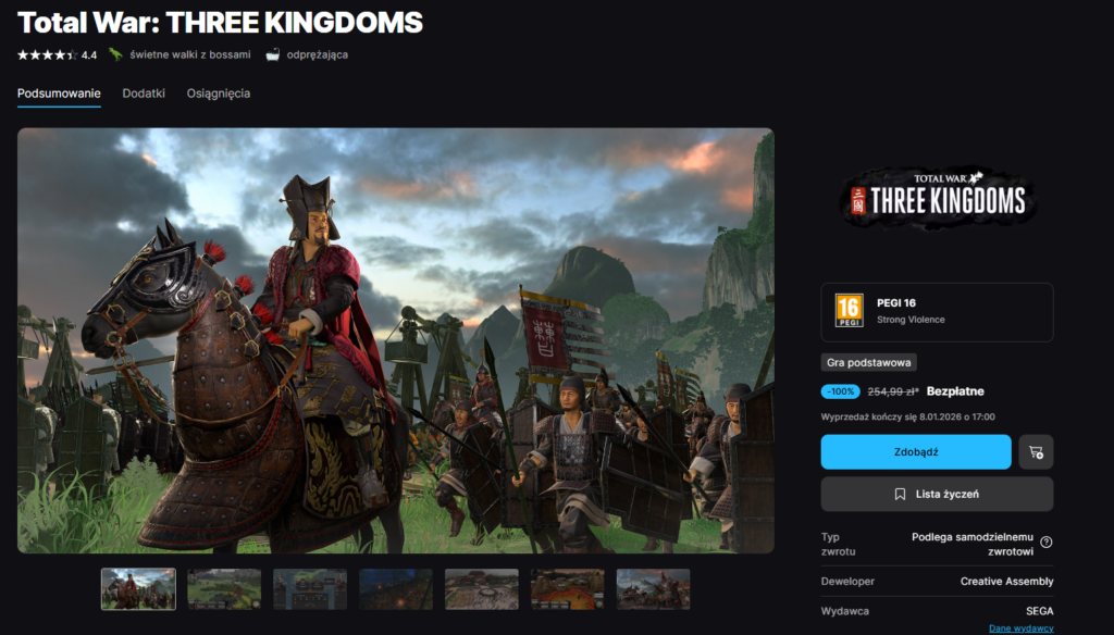 Gra Total War THREE KINGDOMS za darmow Epic Games Store od godziny do 8 stycznia.