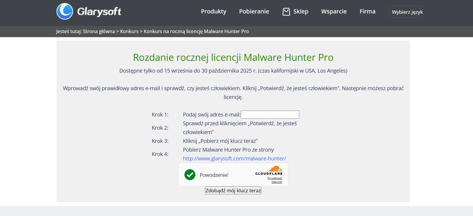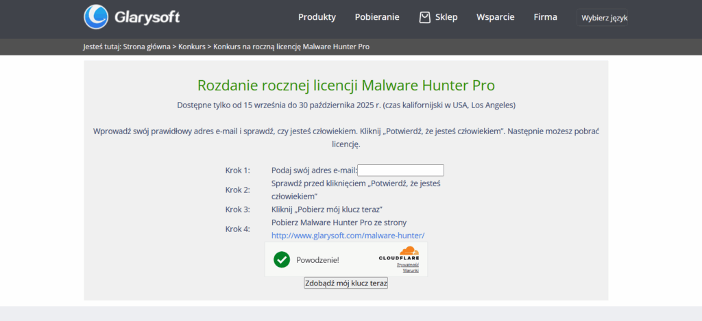– Odwiedź stronę promocji https://www.glarysoft.com/giveaway/mhp_videoproc/ – Wpisz swój adres e-mail, wprowadź reCAPTCHA i kliknij przycisk „Get My Key Now”.- Na stronie pojawi się Twój kod licencyjny – skopiuj go.