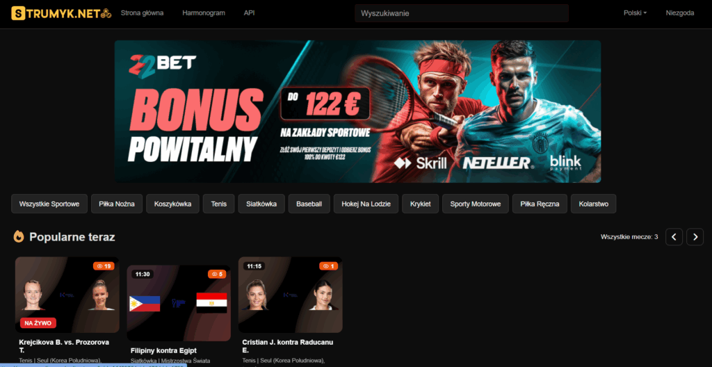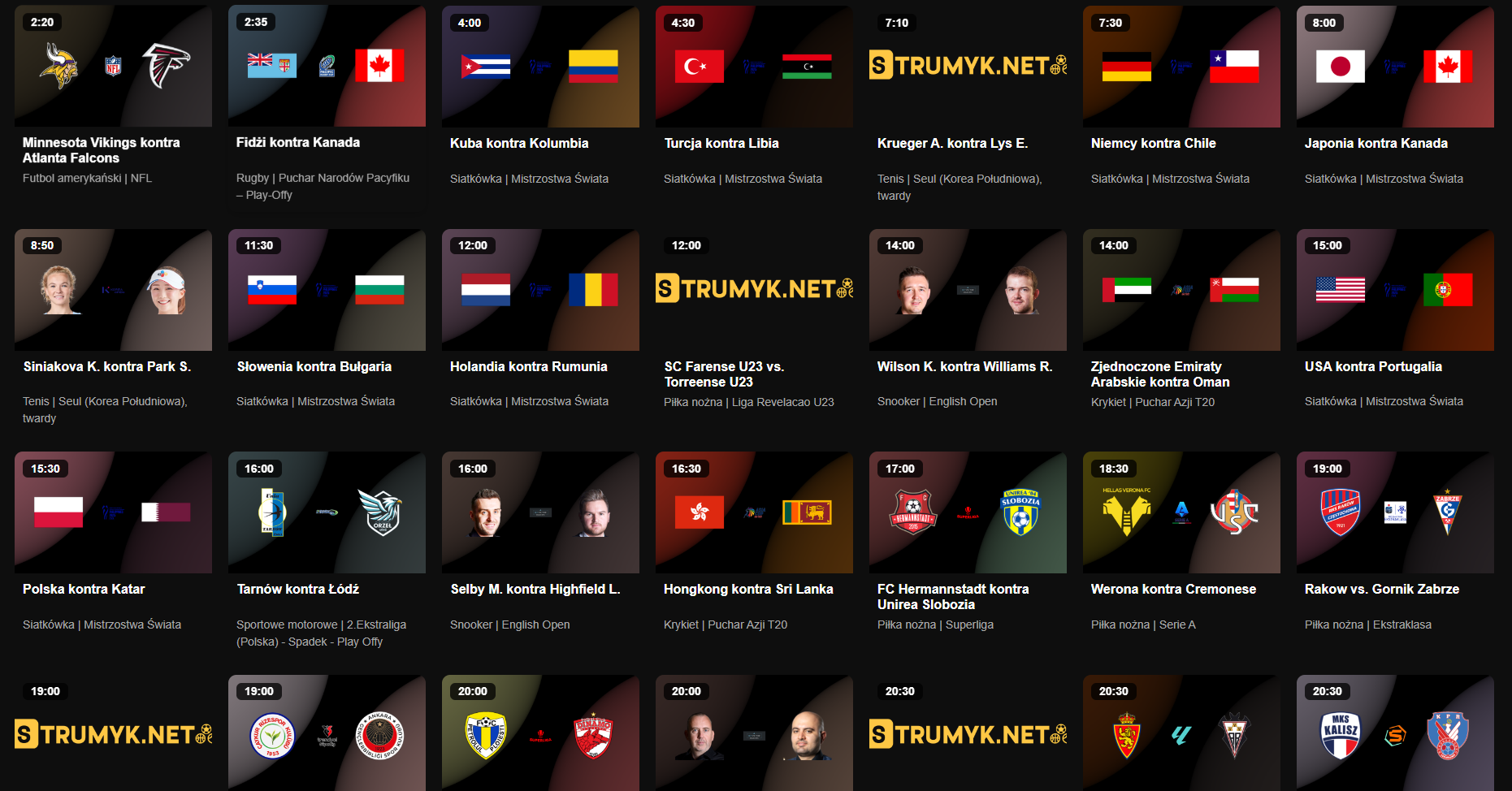 - Opis serwisu: Strumyk TV to nieoficjalna platforma streamingowa, która agreguje linki do darmowych transmisji meczów na żywo z różnych lig i dyscyplin sportowych. Obejmuje piłkę nożną (Premier League, La Liga, Bundesliga, Ekstraklasa, Serie A), MMA (Fame MMA, KSW), freak fighty, koszykówkę (NBA), tenis, siatkówkę, Formułę 1 i więcej. Działa na komputerach, smartfonach (Android/iOS) i bez rejestracji – wystarczy wejść na stronę i wybrać stream. Jest popularny w Polsce ze względu na brak opłat, ale jakość bywa niska (buffering, reklamy), a dostępność zmienia się często z powodu blokad.