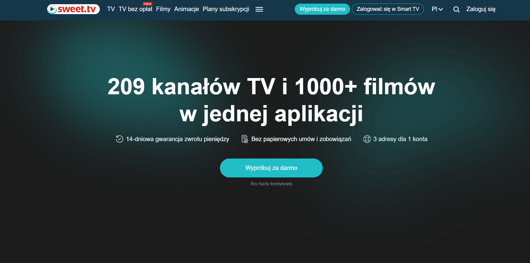 Na stronie internetowej u góry znajduje się przycisk Wypróbuj za darmo. Po wybraniu formy rejestracji, można skorzystać z darmowego okresu próbnego. Obecnie jest kilkadziesiąt kanałów po polsku na sweet.tv Oglądaj w najlepszej jakości HD i 4K.